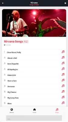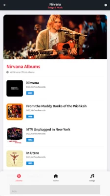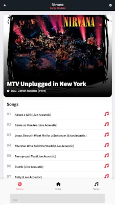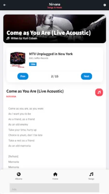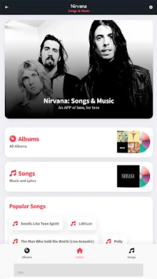 Cikin "Nirvana: Songs & Music", zaka sami cikakken tarihin faifan waƙoƙin ƙungiyar. Kowane faifai yana tare da hotonsa na asali, ranar da aka saki shi, da kuma jerin dukkan waƙoƙin da ke ciki. Ba wai kawai jerin waƙoƙi ba, har ma zaka iya karanta dukkan kalmomin waƙoƙin Nirvana, waɗanda aka nuna su tare da kowace waƙa. Wannan yana ba ka damar zurfafa cikin ma'anoni da saƙonnin da ke tattare da kowace waƙa, yana ƙara maka jin daɗin sauraro da fahimtar fasahar su. Kowane dalla-dalla an tattara shi da kyau don tabbatar da cewa ba ka rasa komai ba.